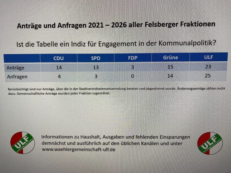 Eine Übersicht über die vielen Tagesordnungspunkte und Themen im Stadtparlament und unsere Aktivitäten findest Du HIER in tabellarischer Form aufbereitet. Daraus erkennt man auch, dass ULF und GRÜNE die mit Abstand aktivsten Fraktionen im Stadtparlament sind.